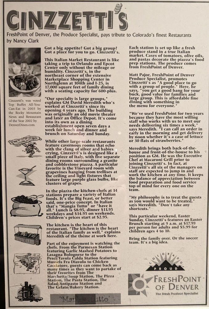 Cinzzetti's Italian Market Restaurant in Northglenn, CO offers a diverse Italian buffet experience with a wide array of fresh and flavorful dishes. From famous House Salad to Tuscan-spiced Rotisserie Chicken, each item is meticulously prepared at 14 action stations for a true culinary delight. Customers rave about the exceptional service, bustling ambiance, and the wide variety of options available. Whether you enjoy classics like Lasagna Bolognese or explore unique offerings like Greek Orzo Salad, there is something for every palate. The restaurant's spacious interior mimics an Italian square, creating an immersive dining atmosphere. With a focus on cleanliness, high-quality ingredients, and attentive staff, Cinzzetti's promises a memorable and satisfying dining experience for all guests. Make a reservation and indulge in the vibrant flavors of Italy at Cinzzetti's.